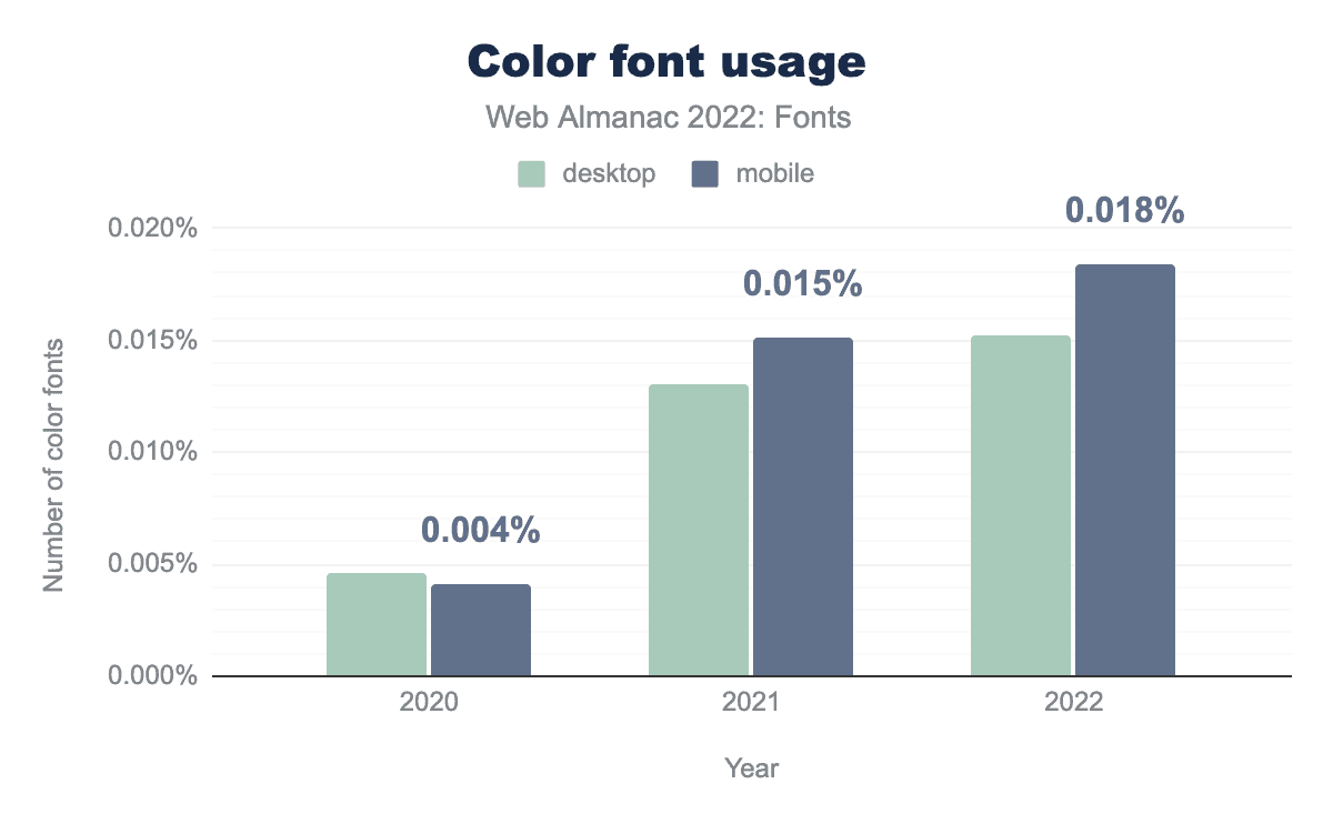 Color fonts usage has grown quite a bit since the last Fonts chapter in 2020. Usage went from 0.004% of pages using color fonts in 2020 to about 0.018% in 2022. While those numbers are still very small, there is a clear growth in their usage.