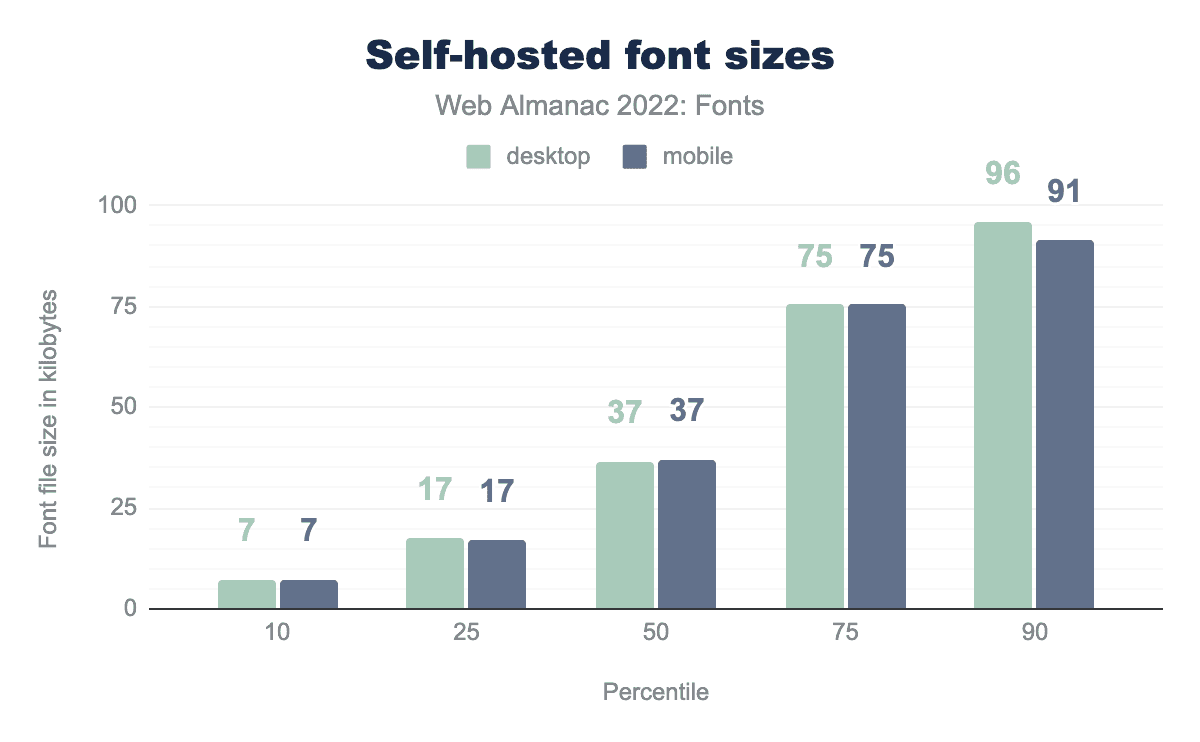 Compression is a great way to reduce the amount of data that needs to be downloaded, but it has its limits. To better understand what influences font file sizes, let’s take a look at the median font sizes across all fonts.