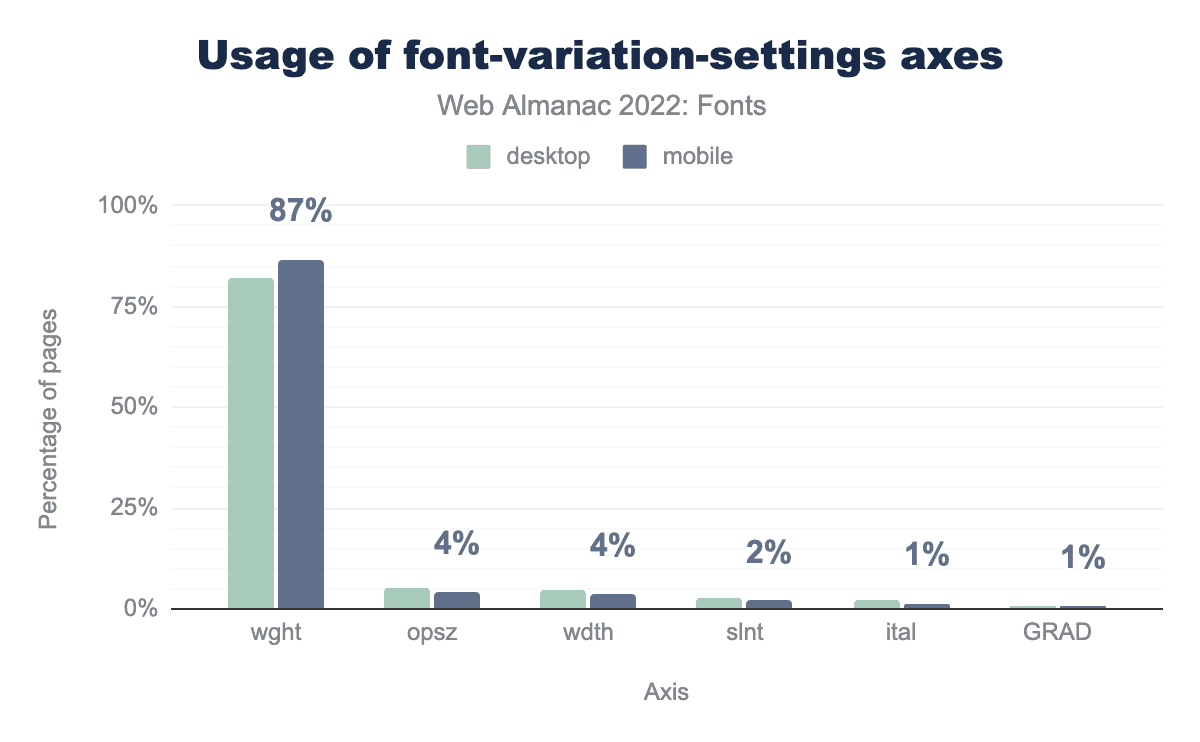 wght is used on 82% of desktop pages and 87% of mobile pages, opsz on 5% and 4% respectively, wdth on 5% and 4%, slnt on 3% and 2%, ital on 2% and 1%, and finally GRAD is used on 1% of desktop and mobile pages.So, how are people using variable fonts? Not surprisingly the weight axis is the most popular value used with the font-variation-settings property, followed by optical sizes, width, slant, italic, and grades.