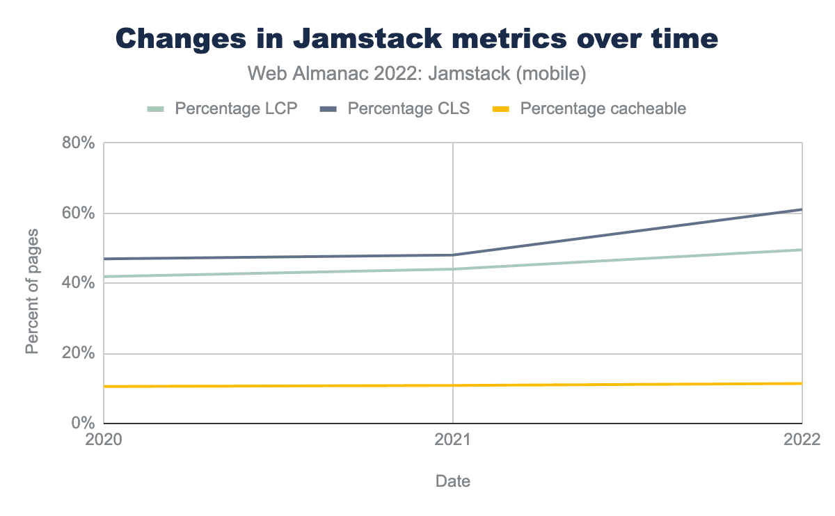Our headline finding is that 3.6% of mobile websites in 2022 seem “Jamstack-y” and that this has grown more than 100% since 2020. On desktop, 2.7% of sites are Jamstack-y and that number is also growing, the difference between the two groups being driven primarily by different numbers of sites meeting the CLS threshold, which varies a lot by device because of layout differences. Again, see above for the many caveats about how approximate this is.