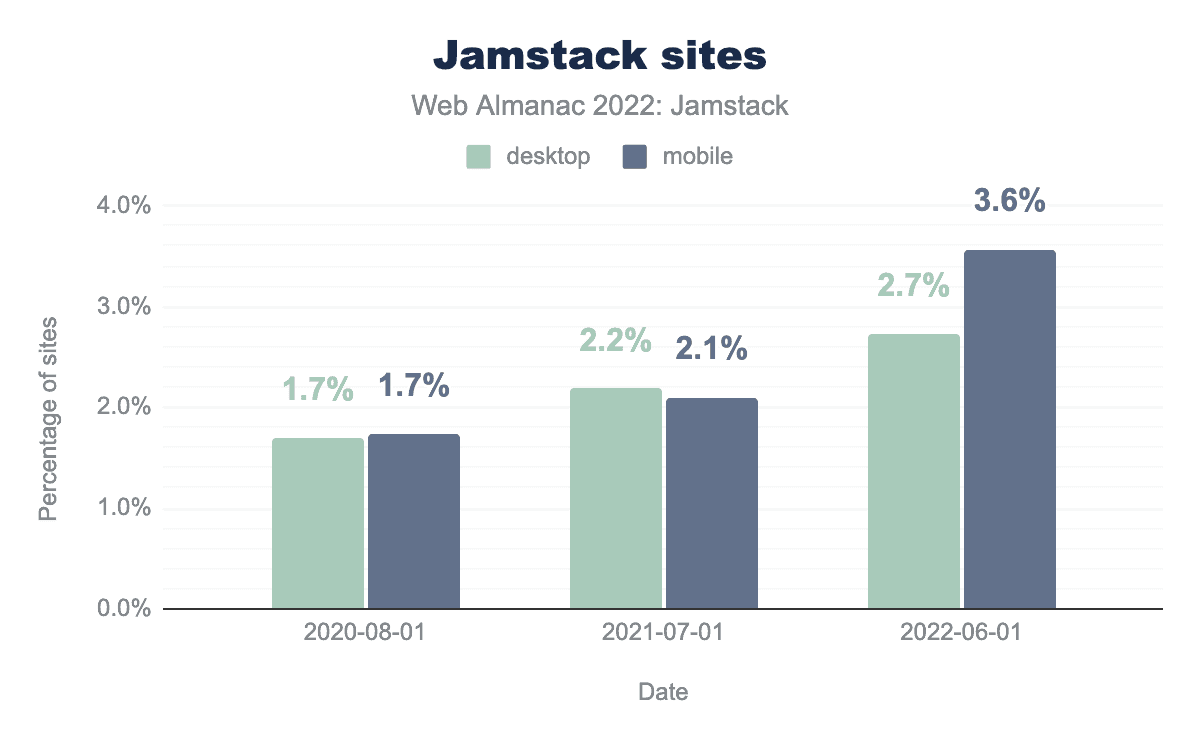Whether or not exactly 3.6% (or 2.7% on desktop) of the web is Jamstack – which, because the definition of Jamstack relies on architectural choices we can’t verify, we cannot definitively say – what we can be sure of is that Jamstack is growing. The percentage of sites that meet all of our criteria has been getting steadily bigger year on year. The web is getting more “Jamstack-y”.