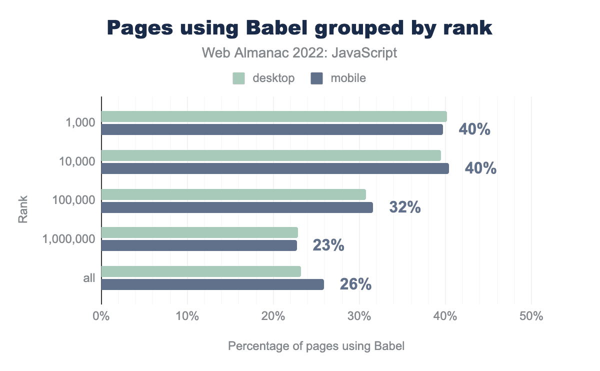 Transpilers are often used in toolchains at build-time to transform newer JavaScript features into a syntax that can be run in older browsers. Because JavaScript has evolved rapidly over the years, these tools are still in use. New to this year’s Web Almanac is an analysis of the usage of Babel in delivering widely compatible, production-ready JavaScript. The singular focus on Babel specifically is due to its wide usage in the developer community over alternatives.