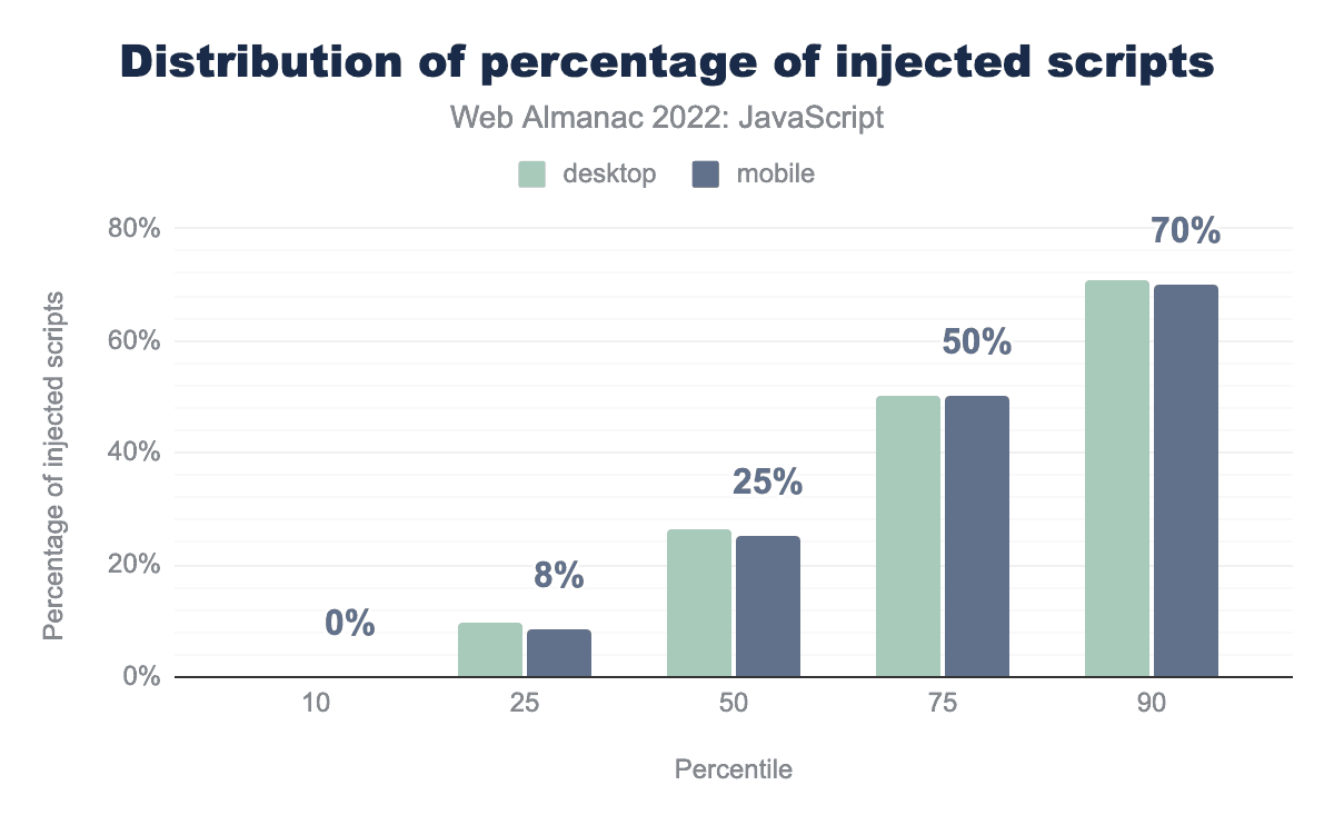At the median, we see that 25% of a page’s scripts are injected, as opposed to leaving them discoverable in the initial HTML response. More concerning is that the 75th and 90th percentiles of pages inject 50% and 70% of scripts respectively.