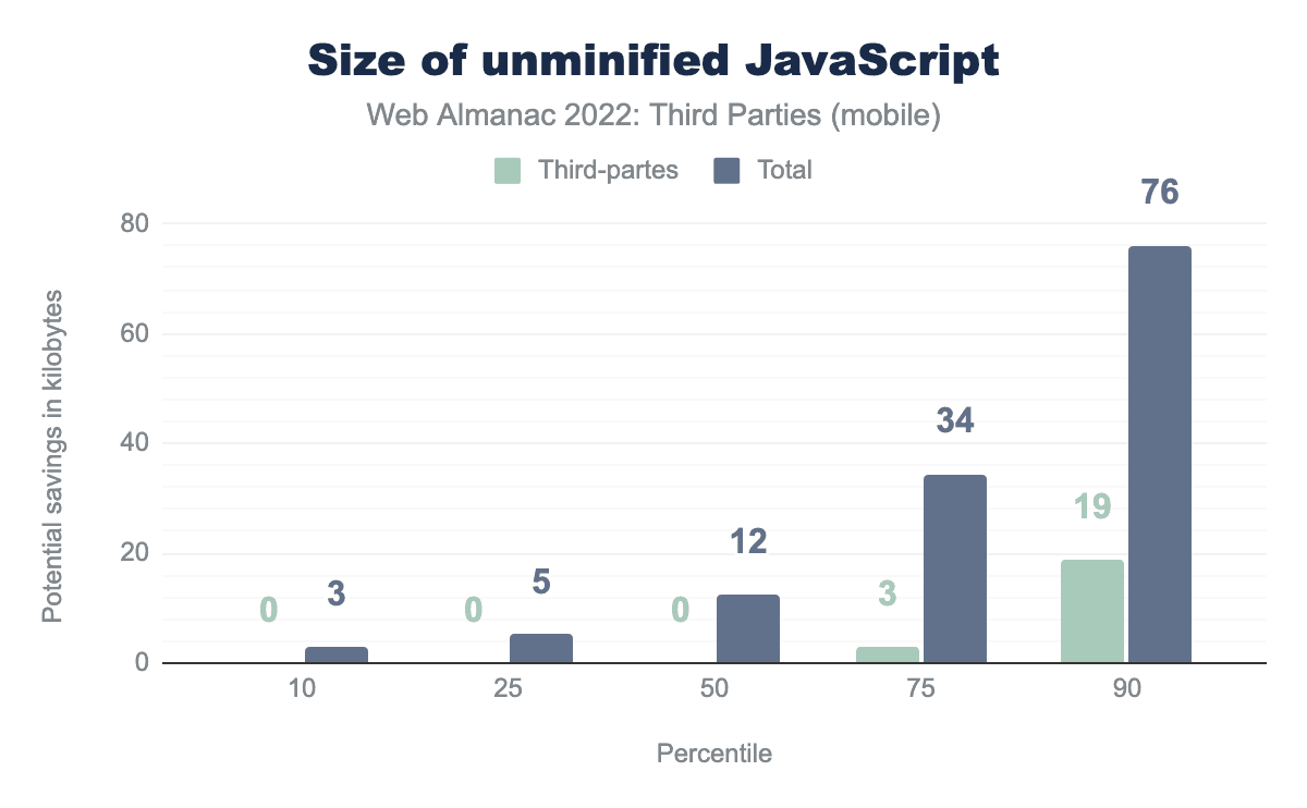 As was the case last year, this year marks yet another increase in the amount of JavaScript shipped to browsers. From 2021 to 2022, an increase of 8% for mobile devices was observed, whereas desktop devices saw an increase of 10%. While this increase is less steep than in previous years, it’s nonetheless the continuation of a concerning trend. While device capabilities continue to improve, not every one is running the latest device. The fact remains that more JavaScript equates to more strain on a device’s resources.
