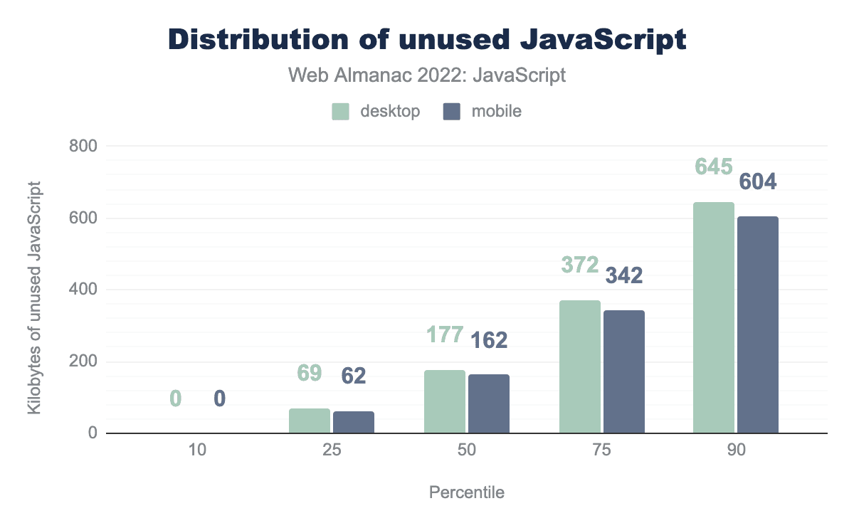 According to Lighthouse, the median mobile page loads 162 KB of unused JavaScript. At the 90th percentile, 604 KB of JavaScript are unused. This is a slight uptick from last year, where the median and 90th percentile of unused JavaScript was 155 KB and 598 KB, respectively. All of this represents a very large amount of unused JavaScript, especially when you consider that this analysis tracks the transfer size of JavaScript resources which, if compressed, means that the decompressed portion of used JavaScript may be a lot larger than the chart suggests.