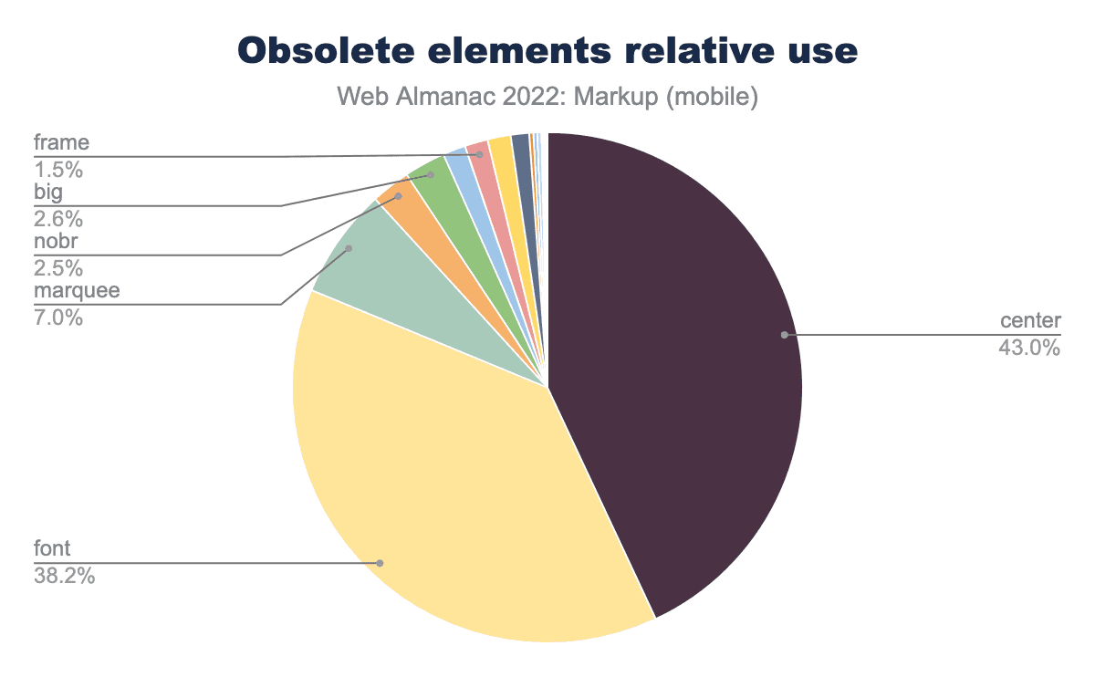 center is 43.0% of obsolete element usage on mobile, font is 38.2%, marquee is 7.0%, nobr 2.6%, big 2.6%, frame 1.5% and the rest of the pie is made up of unlabelled other elements.Attributes