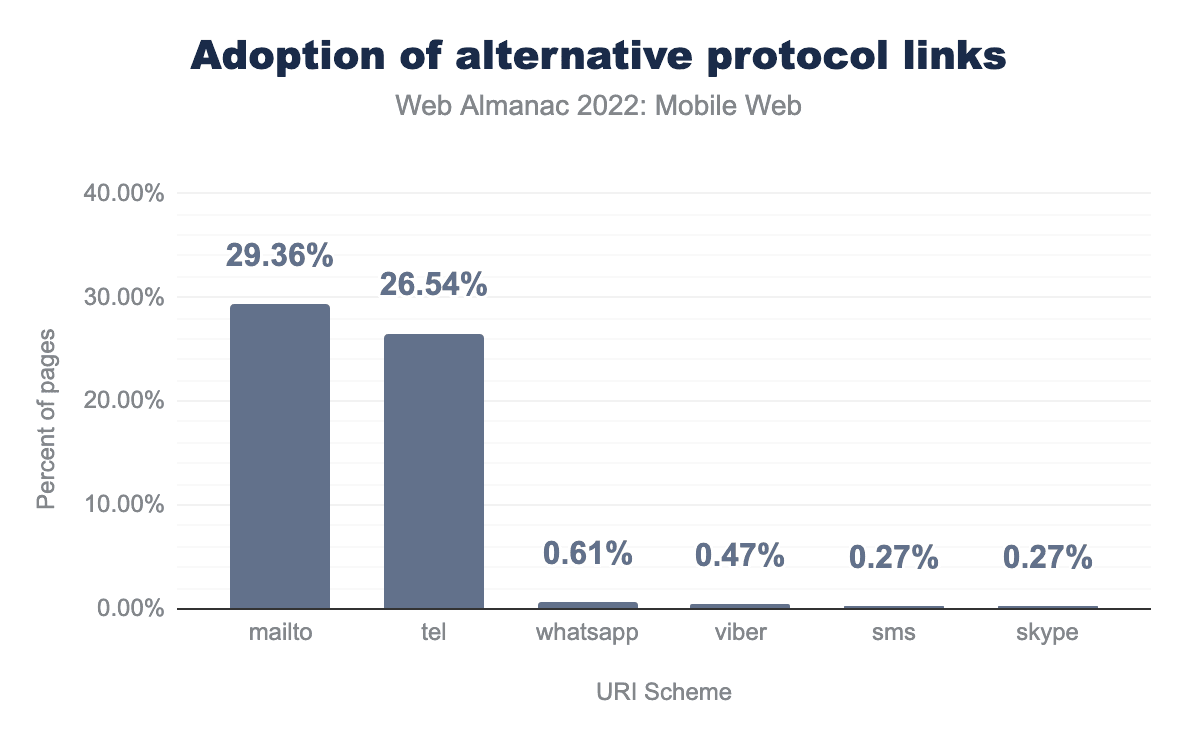 The figure above outlines how the different alternative protocol links are being used on the web in 2022. The most popular options are: mailto for email, tel to make a call, sms to send a text message, and other application-specific protocols for different messaging services like WhatsApp, Skype, and Viber.