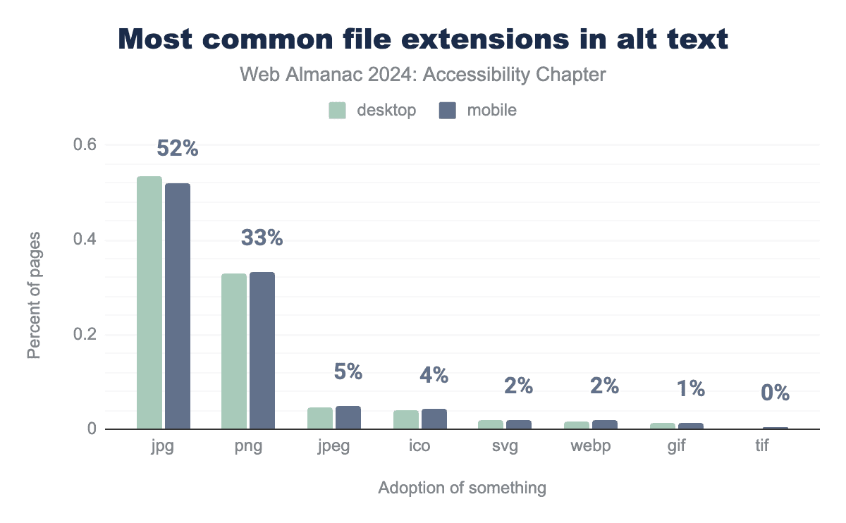 We discovered that over 50% of mobile sites include the prefers-reduced-motion media query, up from 34% in 2022. This is important because digital animations can harm individuals with vestibular disorders; using this query allows for adapting or removing such animations to improve accessibility. Mozilla’s Developer community has some good resources on building motion-sensitive sites.