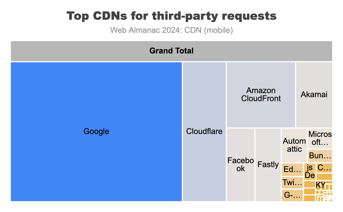 The above figure highlights third-party domain usage, with Google leading the list at 54% market share, followed by well-known CDN providers such as Cloudflare (14%), Amazon CloudFront (10%), Akamai (5%), and Fastly (4%). Notably, Facebook also appears prominently in the rankings, holding a 4% share.