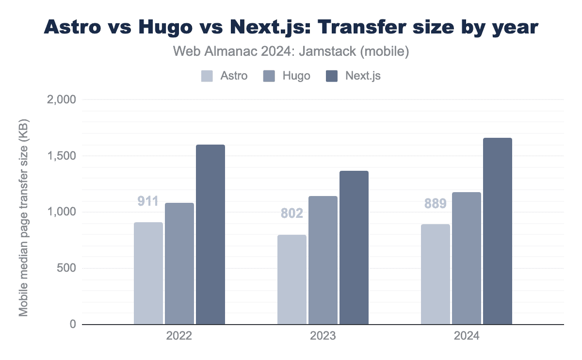 Focusing on the three standout Static Site Generators in the Prerendered category—Astro, Hugo, and Next.js—gives us another lens to analyze page weight. Note: this analysis only includes sites in the Prerendered category to keep the comparison fair.