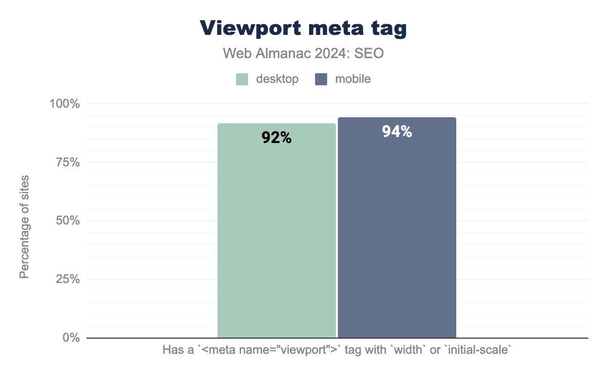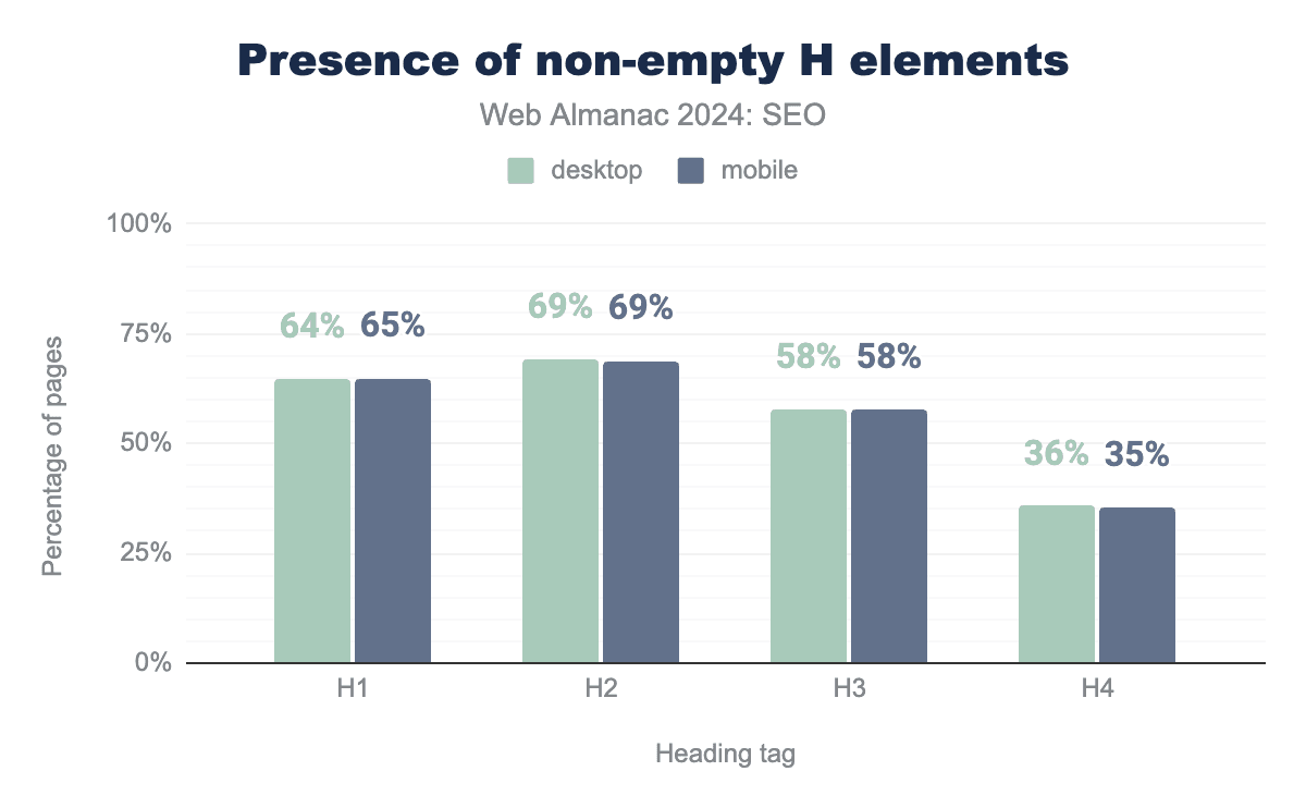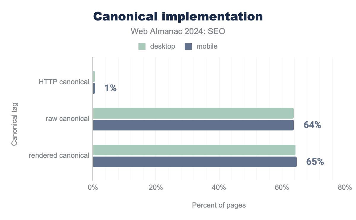 canonical tag usage was up slightly in 2024. In 2022, 61% of mobile and 59% of desktop pages used canonical tags. In 2024, it was up to 65% of mobile and 69% of desktop pages.
