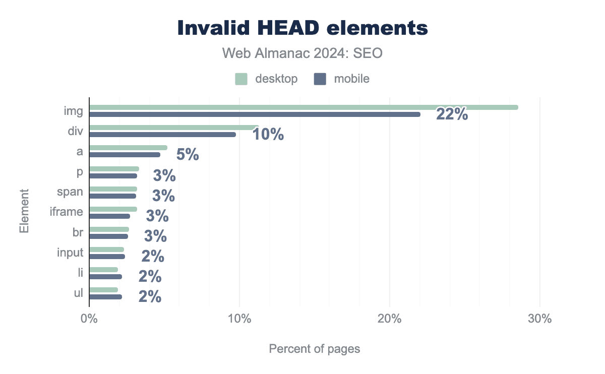 Misapplied <div> tags also substantially increased from 2022. In 2024, 11% of desktop and 10% of mobile pages had the <div> element in the <head>. That’s more than a three times increase from 2022 when the invalid <head> occurred on 4% of desktop pages and 4% of mobile pages.