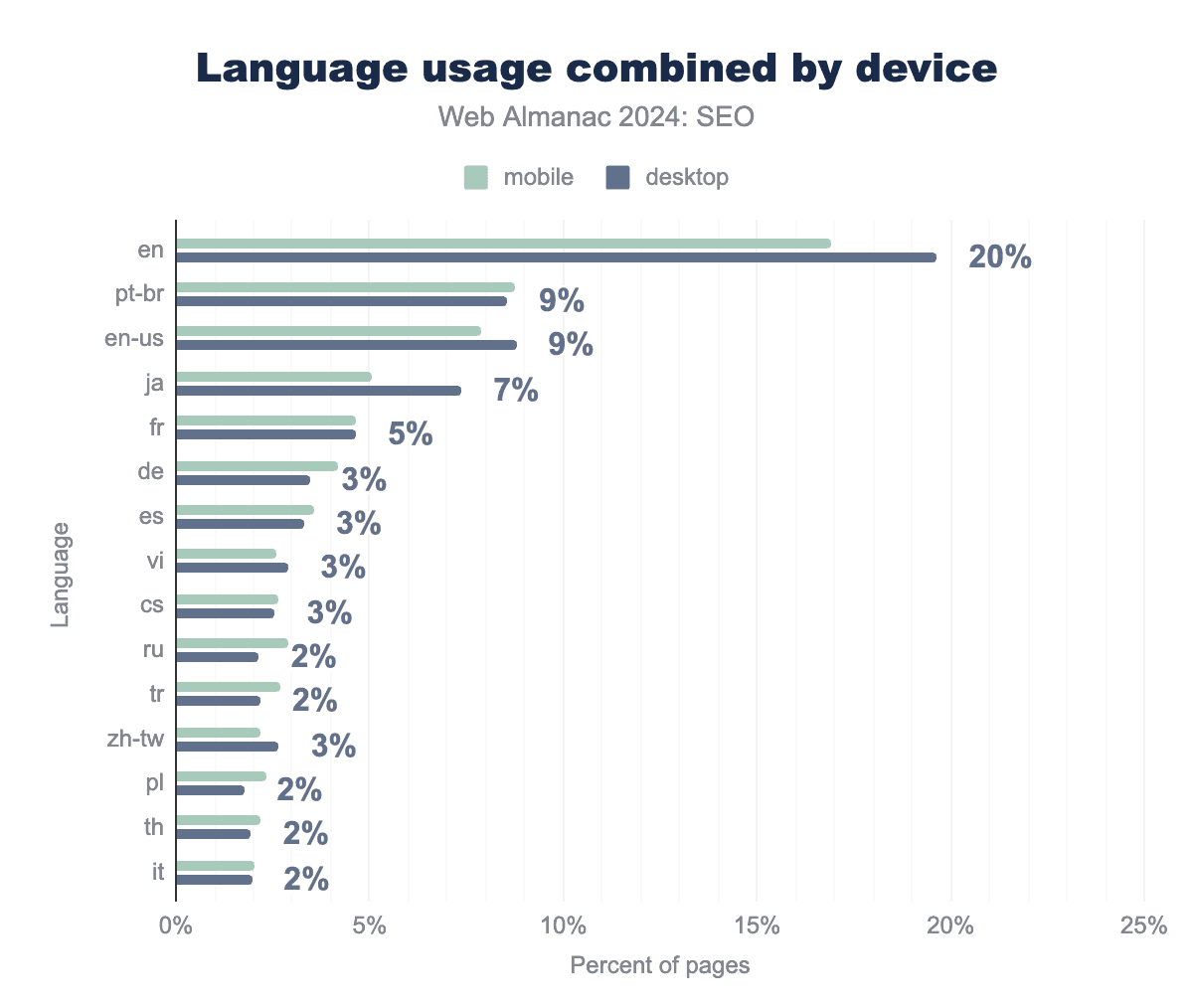 The most common variations of en are en-us (American English) at 2.8% (desktop) and 2.4% (mobile) and en-gb (British English) at 1.7% (desktop) and 1.5% (mobile).
