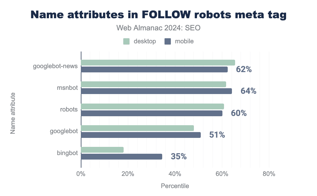 The five most named crawlers in robots directives were the generic robots value, Googlebot, Googlebot-News, MSNBot, and Bingbot. The name attributes used in the follow robots meta tag show that sites with the tags are apt to tailor their rules to specific bots. While there was generally a slight variance by device, there was a large difference for Bingbot which saw significantly more follow directives on mobile pages (35%) compared to desktop (18%).