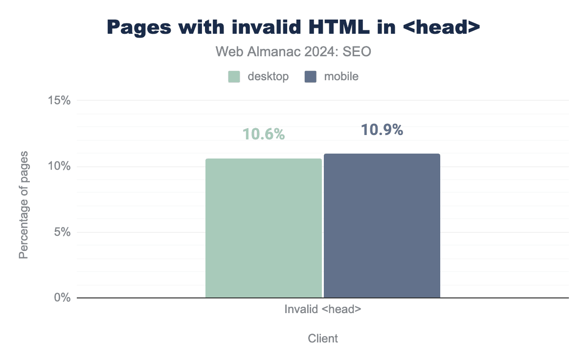 In 2024, 10.9% of mobile pages had <head> breaking invalid HTML elements. That represented a 12% decrease from 2022’s rate of 12.6%. Meanwhile, desktop pages with invalid HTML in the <head> decreased from 12.7% in 2022 to 10.6% in 2024.