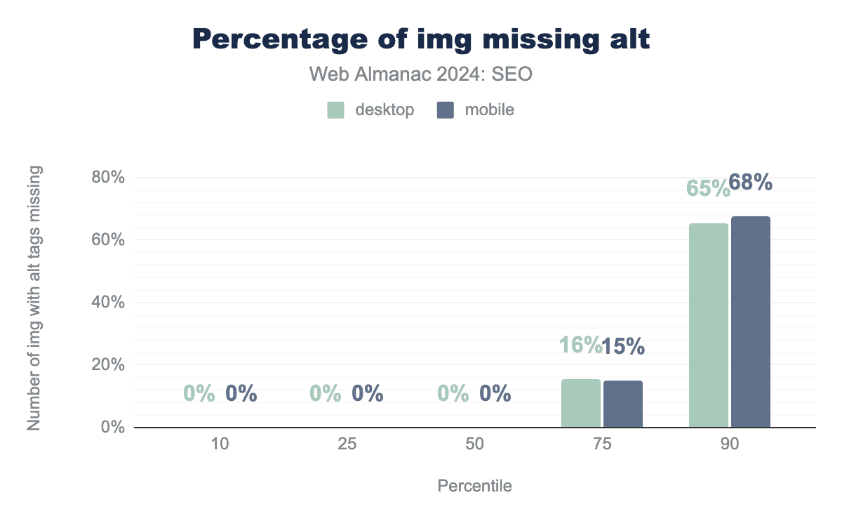 The most prevalent <head> breaking tag was the <img> element, affecting 29% of desktop and 22% of mobile instances of the issue. Comparatively, the 2022 chapter found <img> tags misapplied on 10% of mobile pages and 10% of desktop pages. The likely difference comes from deprecated implementation methods for third-party tools.
