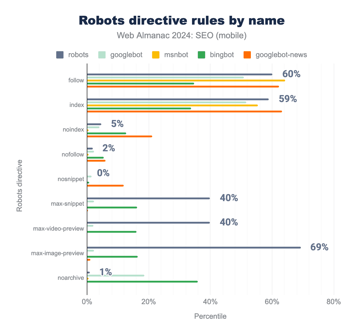 follow: 64%, 62%, , 60%, 51%, and 35%.index: 55%, 63%, 59%, 52% 34%. noindex: 1%, 21%, 5%, 4%, and 13%. nofollow: 1%, 6%, 2%, 2%, and 5%. nosnippet: 0%, 12%, 0%, 1%, and 1%. max-snippet: 0%, 0%, 40%, 2%, and 16%. max-video-preview: 0%, 0%, 40%, 2%, and 16%. max-image-preview: 0%, 1%, 69%, 2%, and 17%. noarchive: 0%, 0%, 1%, 19%, and 36%.When robots directive rules are viewed by their name attributes, we can see varied application rates. This implies that SEOs are adopting directives by specific bot names to curate indexing and serving for individual search engines.