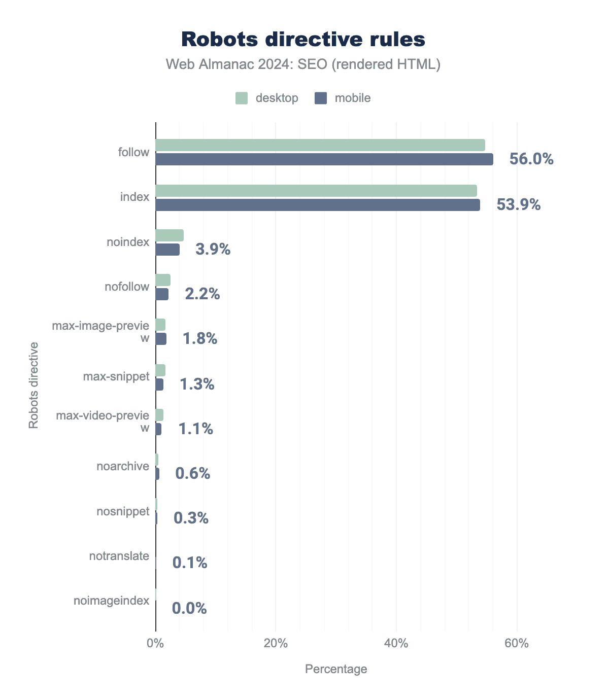 follow, 53.4% used index, 4.7% used nonindex, 2.5% used nofollow, 1.6% used max-image-preview, 1.6% used max-snippet, 1.2% used max-video-preview, 0.5% used noarchive, 0.2% used nosnippet, 0.01% used notranslate, and 0.09% used noimageindex. Mobile rates were similar at 56.0%, 53.9%, 3.9%, 2.2%, 1.8%, 1.3%, 1.1%, 0.6%, 0.3%, 0.10%, and 0.01% respectively.