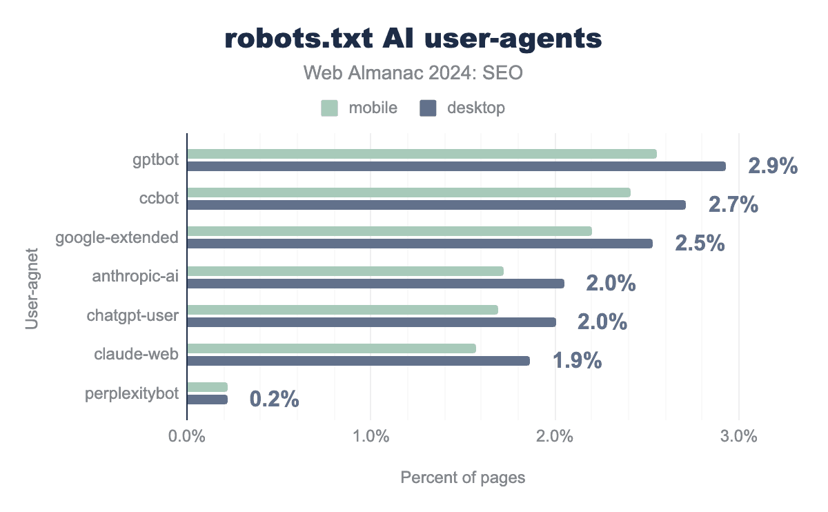 robots.txt files. For desktop, GPTBot is 2.9%, CCBot is 2.7%, Google-Extended is 2.5%, Anthropic-Ai is 2.1%, ChatGPT-User is 2.0%, Claude-Web is 1.9%, and PerplexityBot is 0.2%. The numbers for mobile are slightly slower than desktop at 2.6%, 2.4%, 2.2%,1.7%, 1.7%, 1.6%, and 0.2%, respectively.robots.txt AI user-agent usage.
