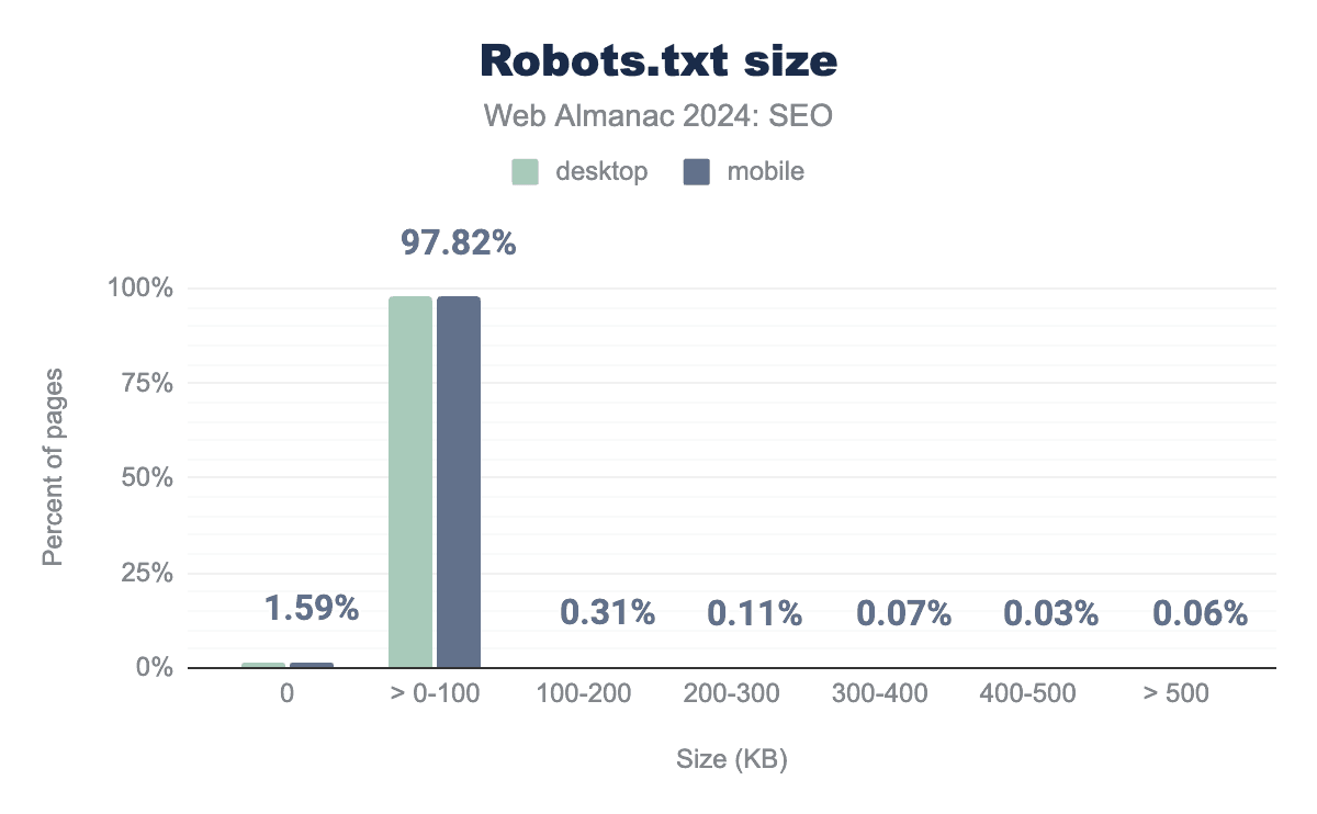 The vast majority of robots.txt files—97.82% of mobile crawls and 97.80% of desktop crawls—were no larger than 100KB.