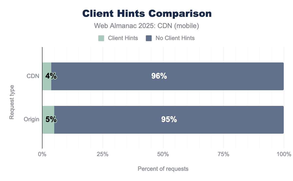 Client Hints buck the usual pattern of CDNs leading adoption: CDN usage was flat year-over-year, while origin requests increased to ~5% in 2025. A likely contributor is cache-key explosion at the edge, which can reduce cache hit rates when Client Hints are incorporated without careful bucketing. This challenge may explain why adoption remains low despite the technology’s potential benefits.