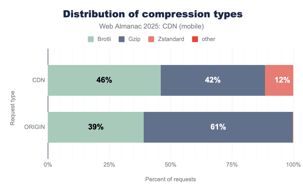 CDNs are leading the adoption of Brotli and Zstandard compression. Compared to 2024, Zstandard saw a significant increase from 3% to 12% in 2025. However, similar to 2024 Gzip remains the majority compression algorithm used by origin servers (61% Gzip vs 39% Brotli).
