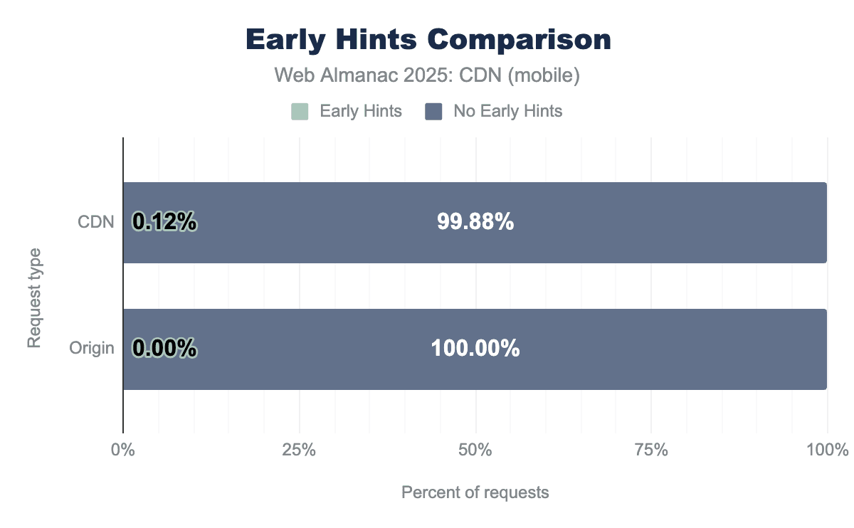 Browser support for Early Hints is widespread, but we found minimal usage in the dataset with only 0.012% of CDN requests. This represents a marginal 0.002% increase from 2024 to 2025. Vercel was the only CDN to support over 1% adoption (2.84%) with Cloudflare and Fastly less than 1%.