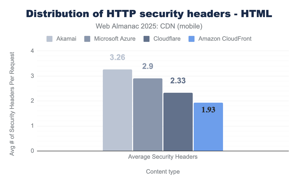 Fastly and Akamai have more secure defaults for security headers when basic features are enabled which drives higher rates of security headers. Amazon CloudFront and Cloudflare require more non-default configurations to inject and enforce security headers leading to a lower adoption.