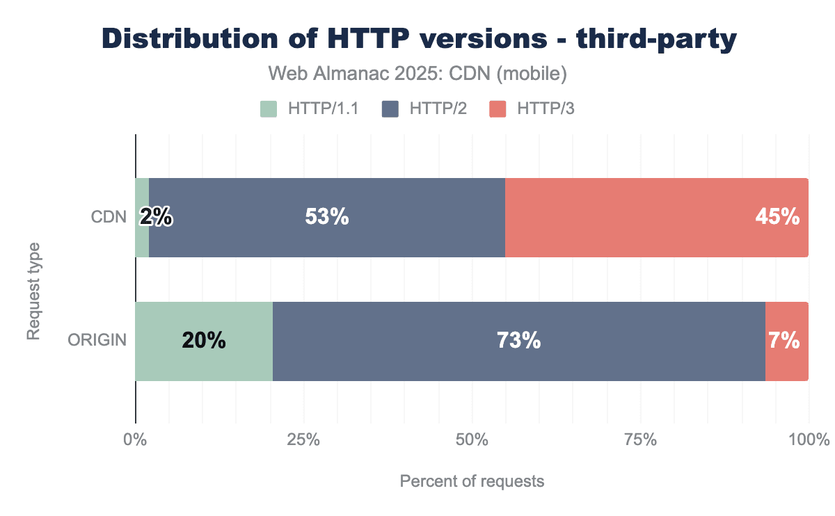 • Protocol Leadership: CDNs show 29-45% HTTP/3 adoption versus <7% for origins