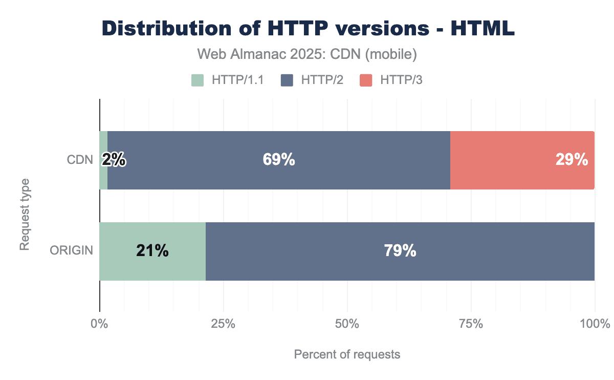 While HTTP/1.1 usage has been on a continued decline with CDNs over the past several years, in 2025 we observed a sharp decrease in CDN usage for HTTP/1.1 going from 16% usage for HTML requests in 2024 to just 2% in 2025. This decrease was even more pronounced for origin requests with 56% HTTP/1.1 requests in 2024 down to 21% in 2025.