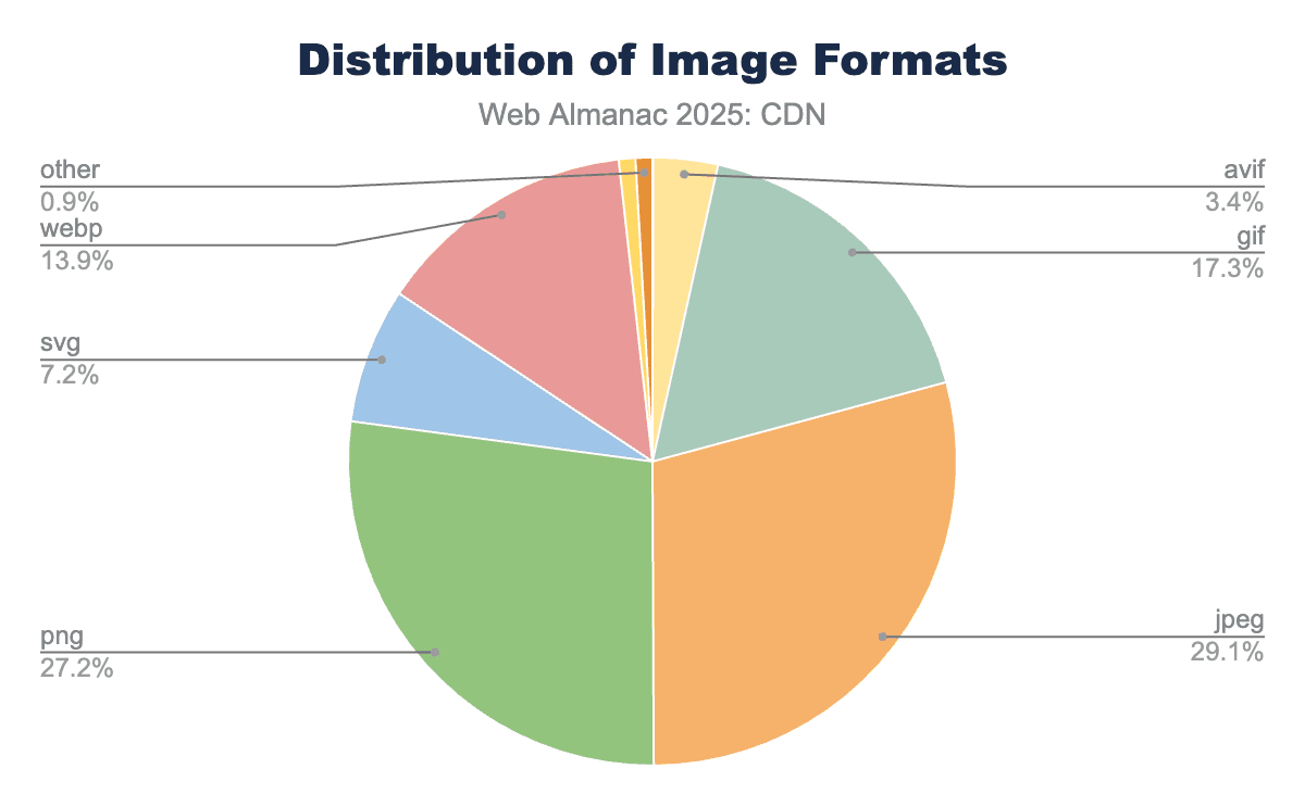Between 2024 and 2025, there was a slight regression in AVIF (-1.9%), SVG (-1.1%), and WebP (-1.8%), offset by small rebounds in GIF (+2.3%) and JPEG (+2.2%), a possible indicator of fallback scenarios or compatibility defaults on less optimized delivery stacks.