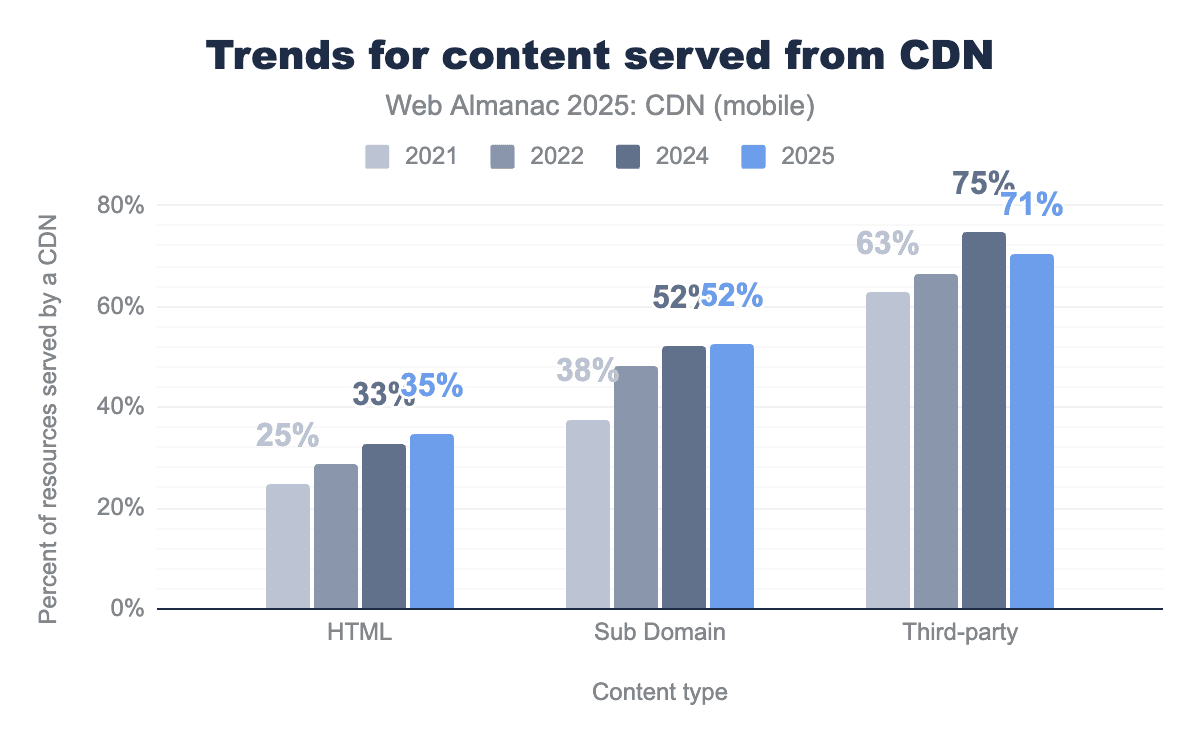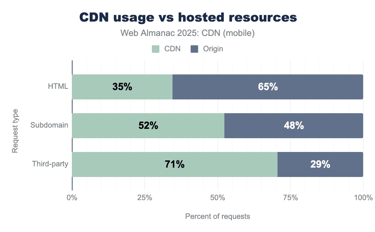 CDNs are often utilized for delivering static content such as fonts, image files, stylesheets, and JavaScript. This kind of content doesn’t change frequently, making it a good candidate for caching on CDN proxy servers. We still see CDNs used more frequently for this type of resource, especially for third-party content, with 71% being served via CDN. Subdomain resources show moderate CDN adoption at 52%, while HTML content has the lowest CDN usage at 35%, as it’s more commonly served directly from origin servers.