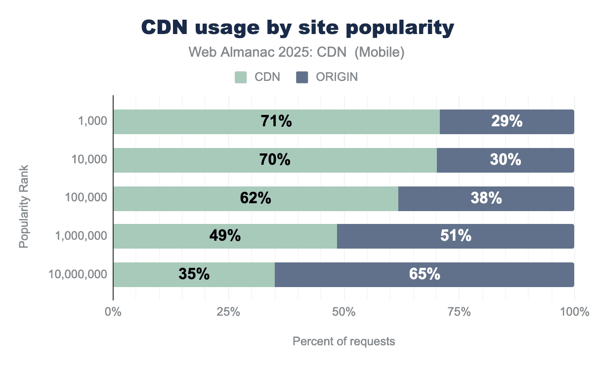 Within our dataset, the data reinforces the role CDNs play in driving the adoption of new protocols among popular websites and static resources. CDNs saw 29% traffic from HTTP/3 with effectively 0% for origin traffic. Compared to 2024, we observed a sharp decrease in CDN usage for HTTP/1.1 in 2025.