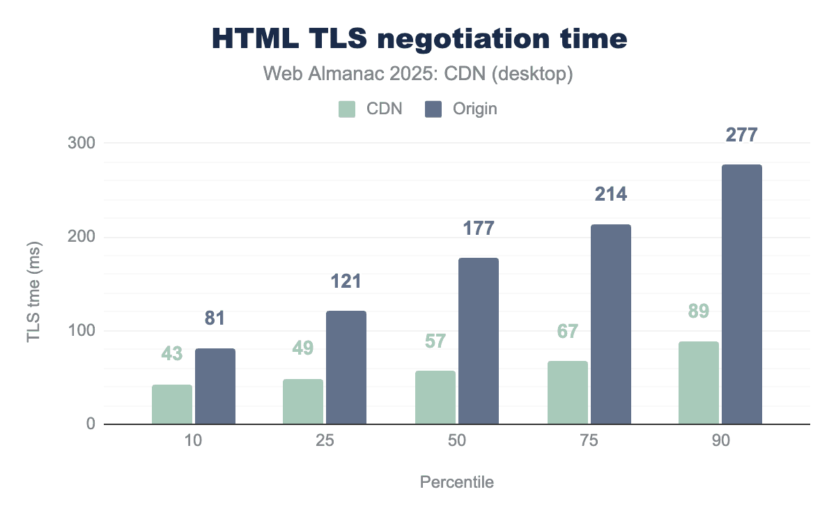 Desktop users experience substantially faster TLS negotiations with CDNs compared to origin servers at every performance level. The median negotiation time for CDNs is 57 milliseconds versus 177 milliseconds for origins, over three times faster. This performance gap persists across the distribution. At the 90th percentile, CDNs complete negotiations in 89 milliseconds while origins require 277 milliseconds.