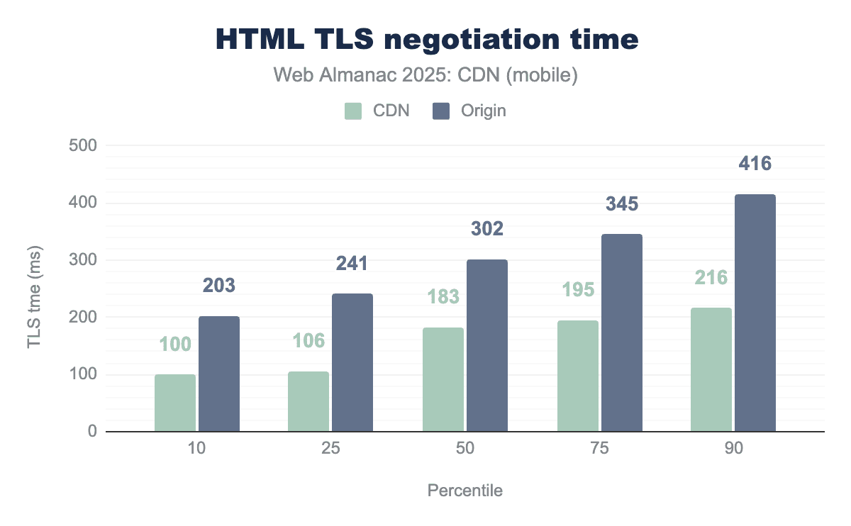 Mobile devices show a similar pattern, with CDN performing better than origin servers, but the overall negotiation times are higher compared to desktop. The median TLS negotiation time for mobile CDN is 183 milliseconds, while for origin servers it’s 302 milliseconds. At the 90th percentile, mobile CDN takes 216 milliseconds, whereas origin servers require 416 milliseconds.