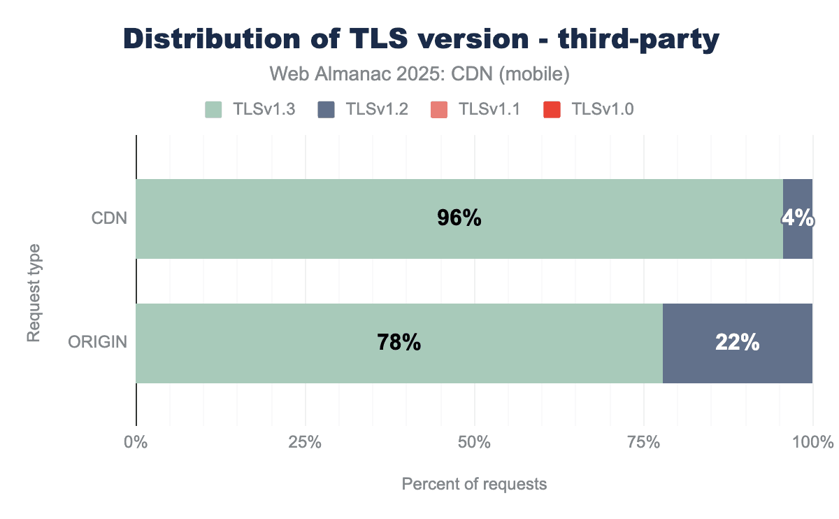 • Security Excellence: 95.6% of CDN traffic uses TLS 1.3, compared to 77.7% for origin servers