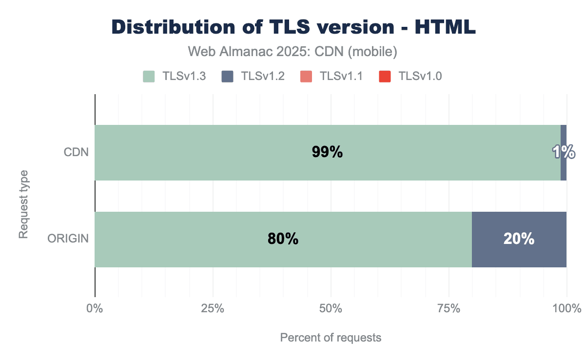Nearly all CDN traffic now uses TLS 1.3, with 99% of requests leveraging the latest protocol version. This benefits developers through faster connection establishment times, directly improving page load speeds. CDN providers continue to be early adopters of new web technologies, which means applications using CDNs get these performance and security enhancements with little to no additional effort.