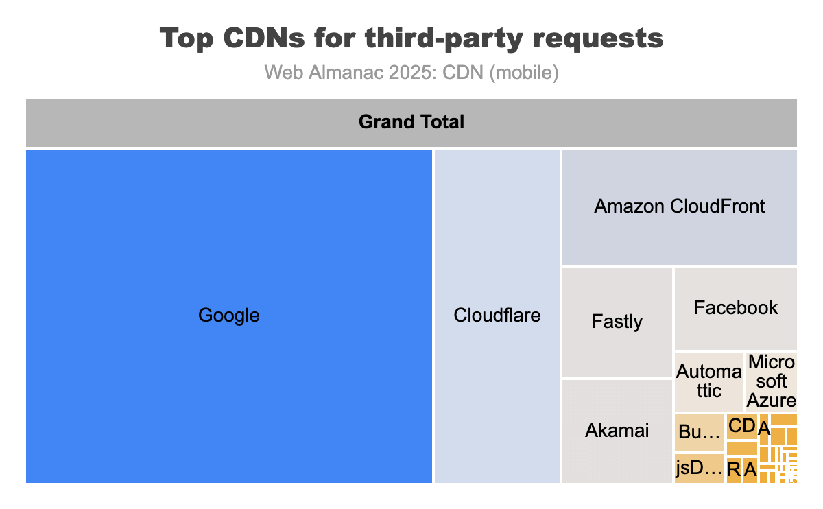 Google leads the list third-party domain usage at 53% market share, followed by well-known CDN providers such as Cloudflare (17%), Amazon CloudFront (11%), Fastly (5%), and Akamai and Facebook (4%).