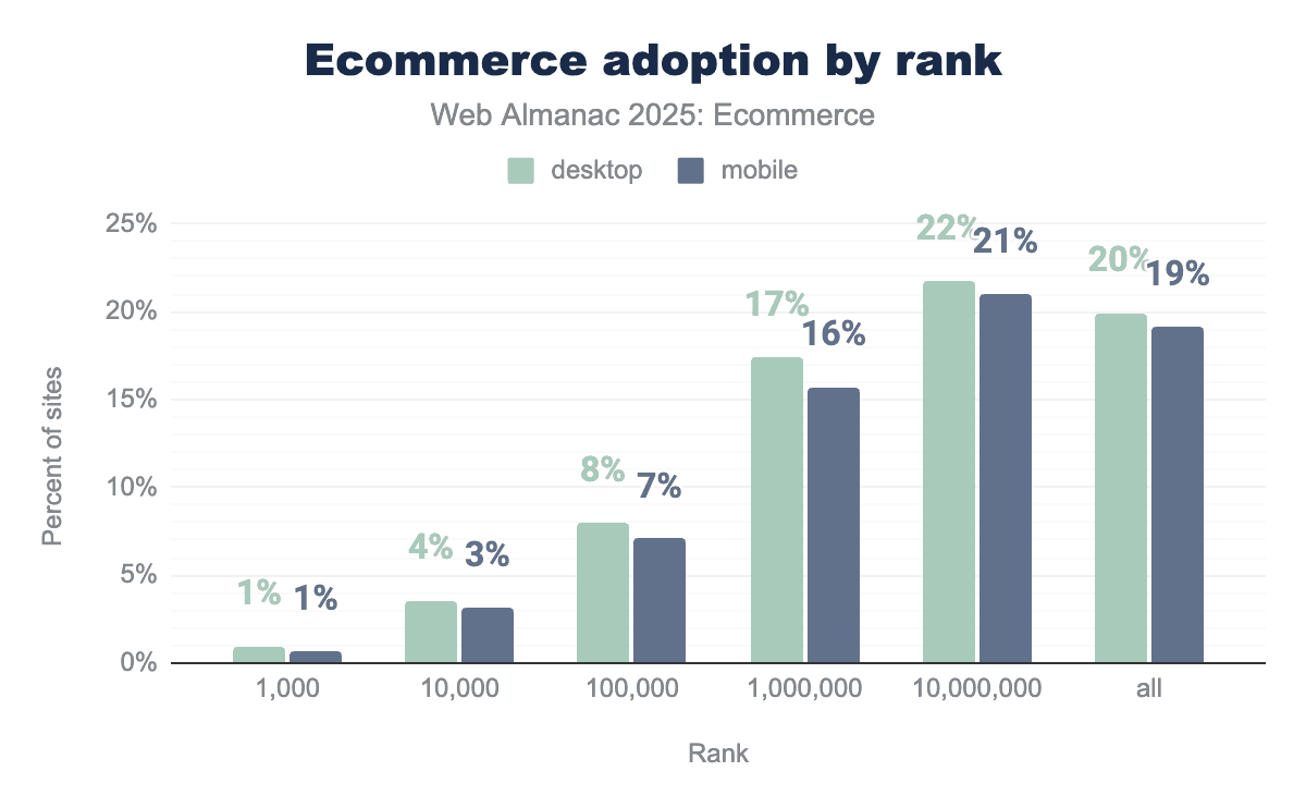 In the 2025 dataset, we detected 19.9% of all analyzed desktop sites and 19.2% of all analyzed mobile sites where ecommerce sites.