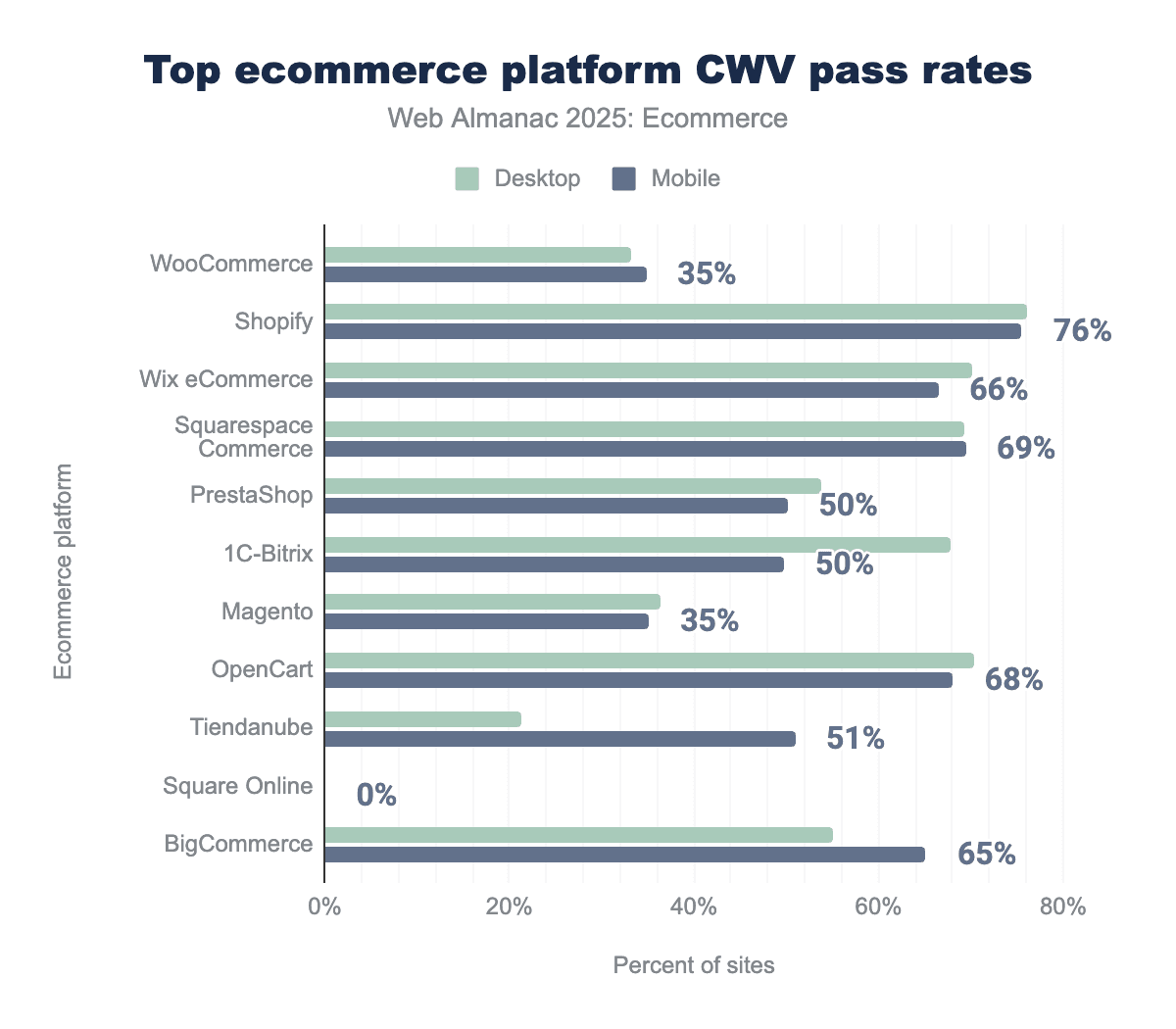 - WooCommerce has scale, but not automatic speed: its CWV pass rates lag behind SaaS-heavy ecosystems, which is consistent with its infinite customization nature.