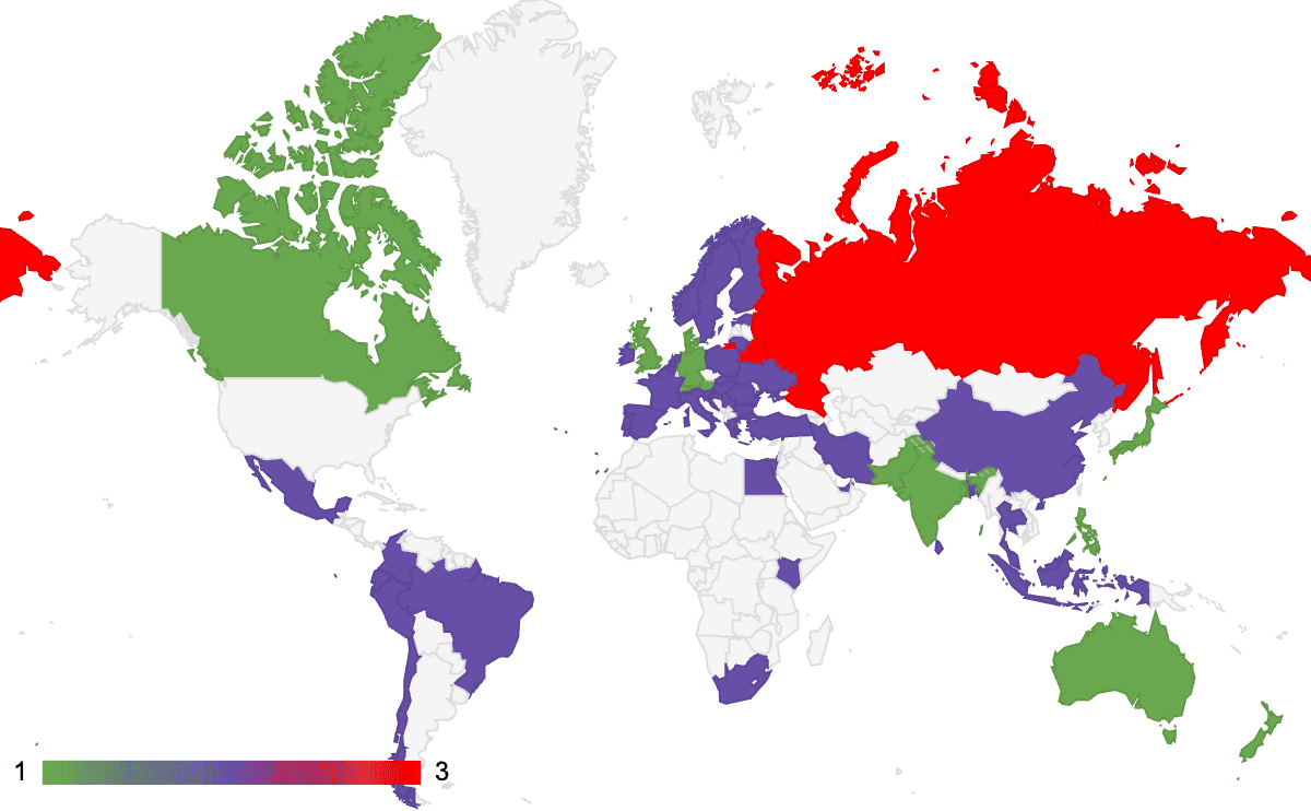 The three leading platforms take the top spot in most countries: WooCommerce (violet), Shopify (green), and 1C-Bitrix (red).