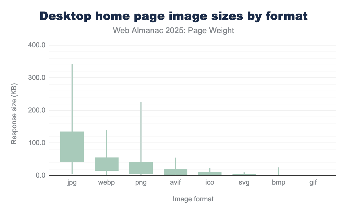 At the 50th percentile, individual image files were 8 KB on both mobile and desktop. It is worth noting that many sites use small images, known as tracking pixels, as part of their analytics. These tiny, often invisible 1x1 pixel images are embedded in web pages and trigger a server request when loaded. Since these files are not differentiated from standard, user-focused image assets, they may cause the median image size to appear smaller than expected.