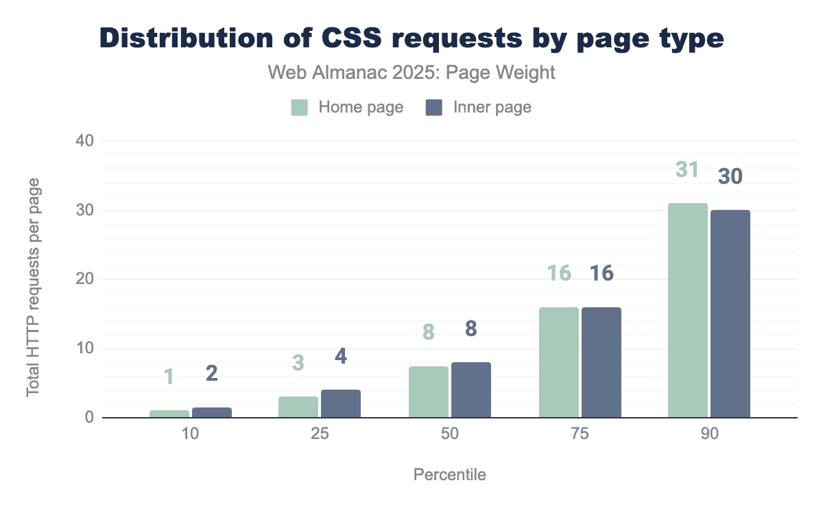 As observed above, inner pages tend to be lighter than home pages. In 2025, the median home page weighted 2.9 MB for desktop and 2.6 MB for mobile. Inner pages were lighter in comparison, with median sizes of 1.8 MB for mobile, and 2 MB for desktop.