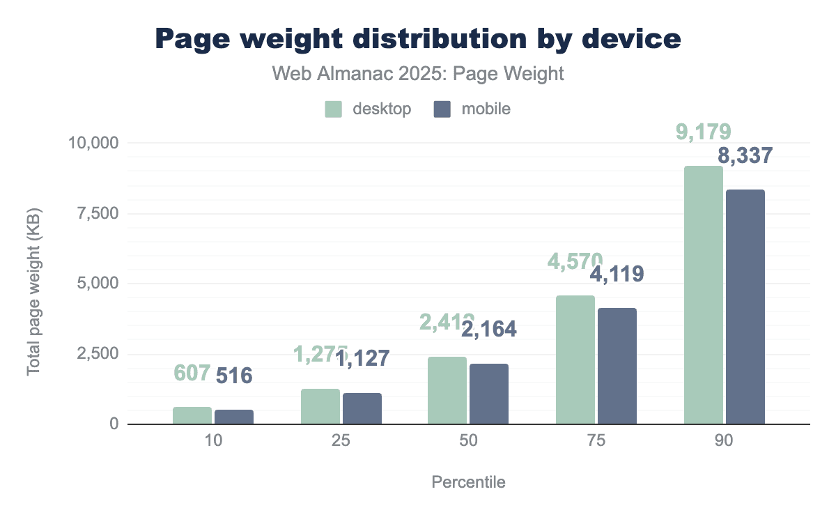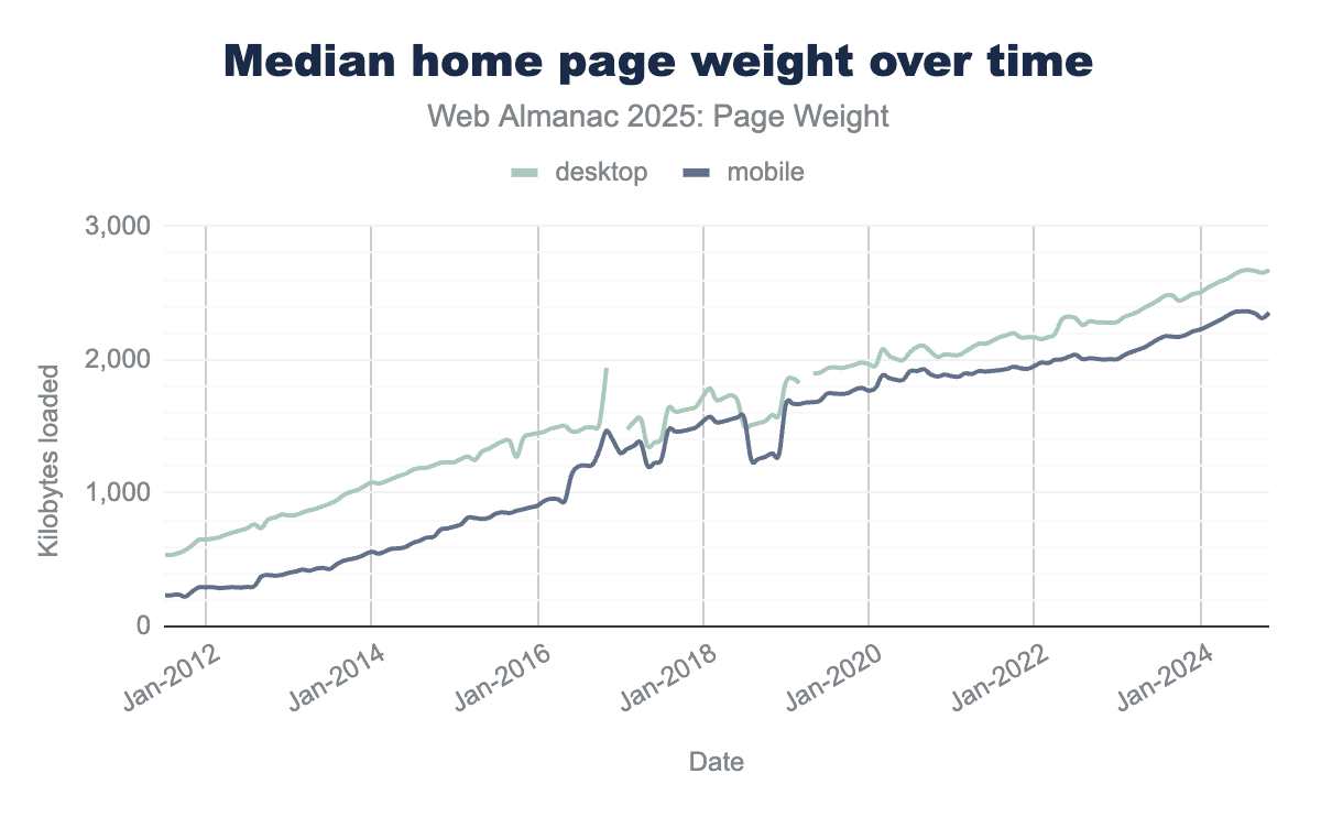 Year over year, the median home page size grew 7.8% to 2.7 MB. The median mobile home page is 2.6 MB, growing 8.4% from 2.4 MB in 2024. In 2025, the median desktop page size reached 2.9 MB, up 7.3% from 2024’s median of 2.7 MB.
