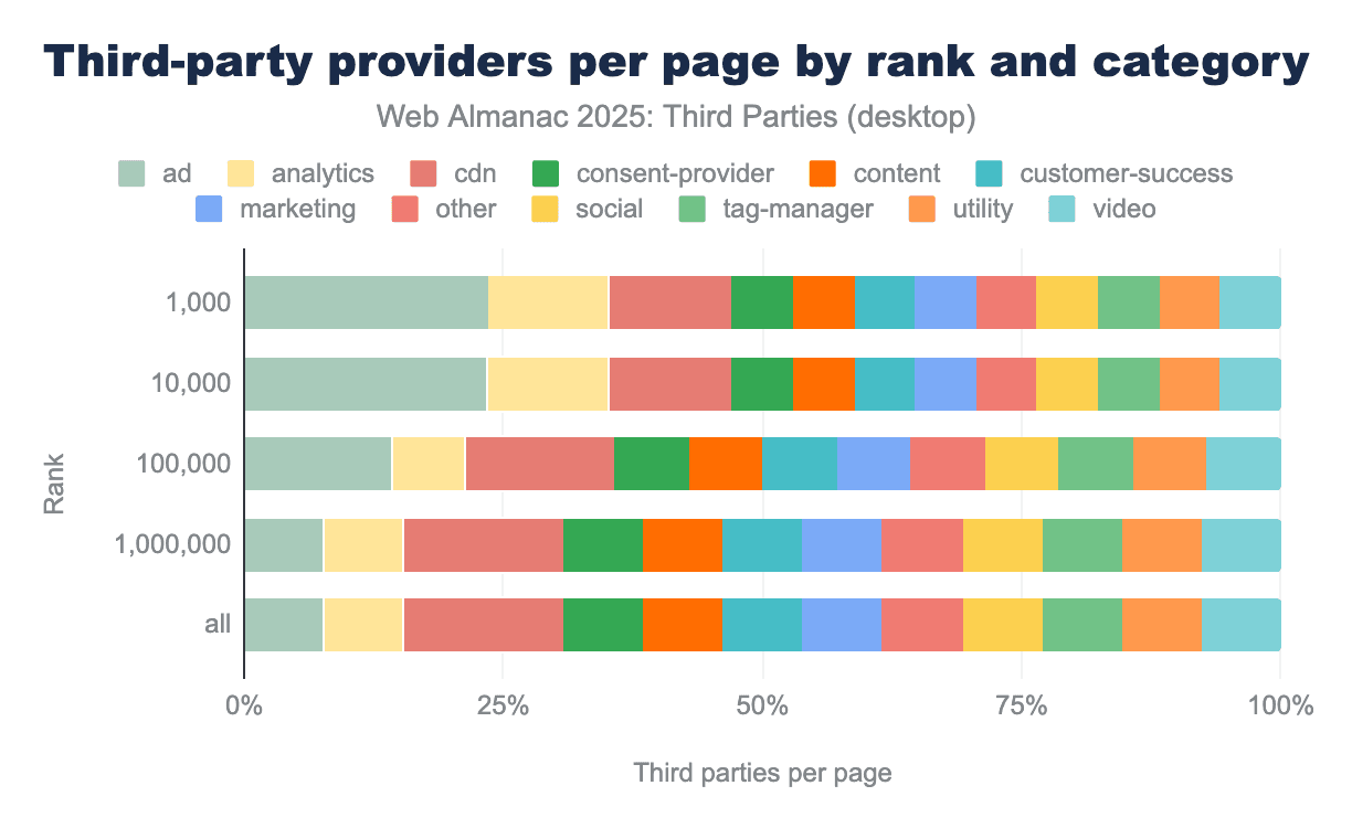 The bar chart shows the median number of third-party providers per page by rank and category. In the previous edition, this analysis focused on the number of third-party domains per page by rank and category, whereas this year we measure the number of unique third-party providers, which results in lower counts overall. This year, the top categories are ad, analytics, and cdn.