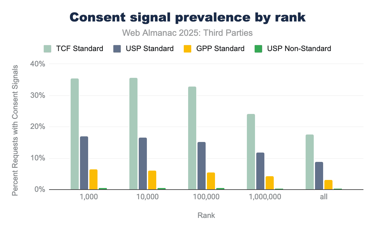 In terms of consent standards, TCF is the dominant consent standard across all website ranks. Among individual third parties, pubmatic.com, adservice.google.com and other ad tech domains receive the highest volume of consent signals.