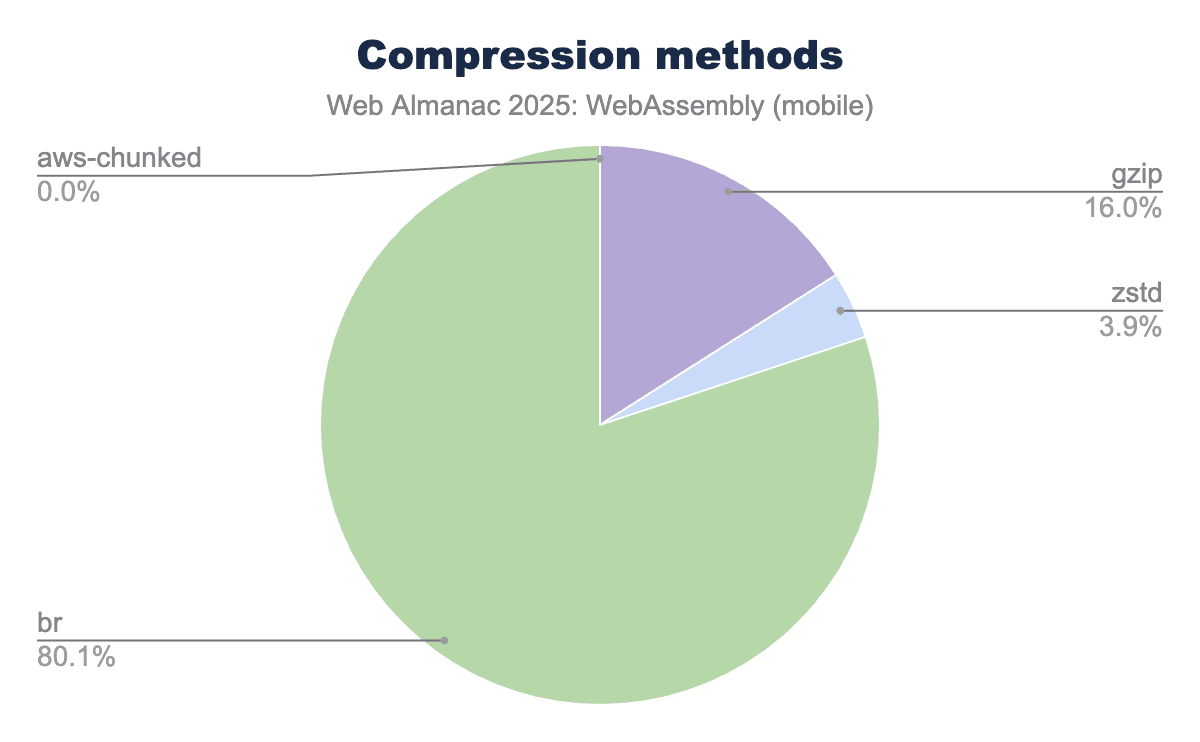The above chart shows the size of response body size, It is often called as “raw response size” that measures only the raw, often decoded—the data payload that client received. It represents the size of the resource itself. However as per the research and common practices for Wasm deliverables, Wasm modules are compressed and optimized with various tools like Brotli and also transfered over network to the client with compression methods like gzip, br, zstd along with Content-Encoding headers.